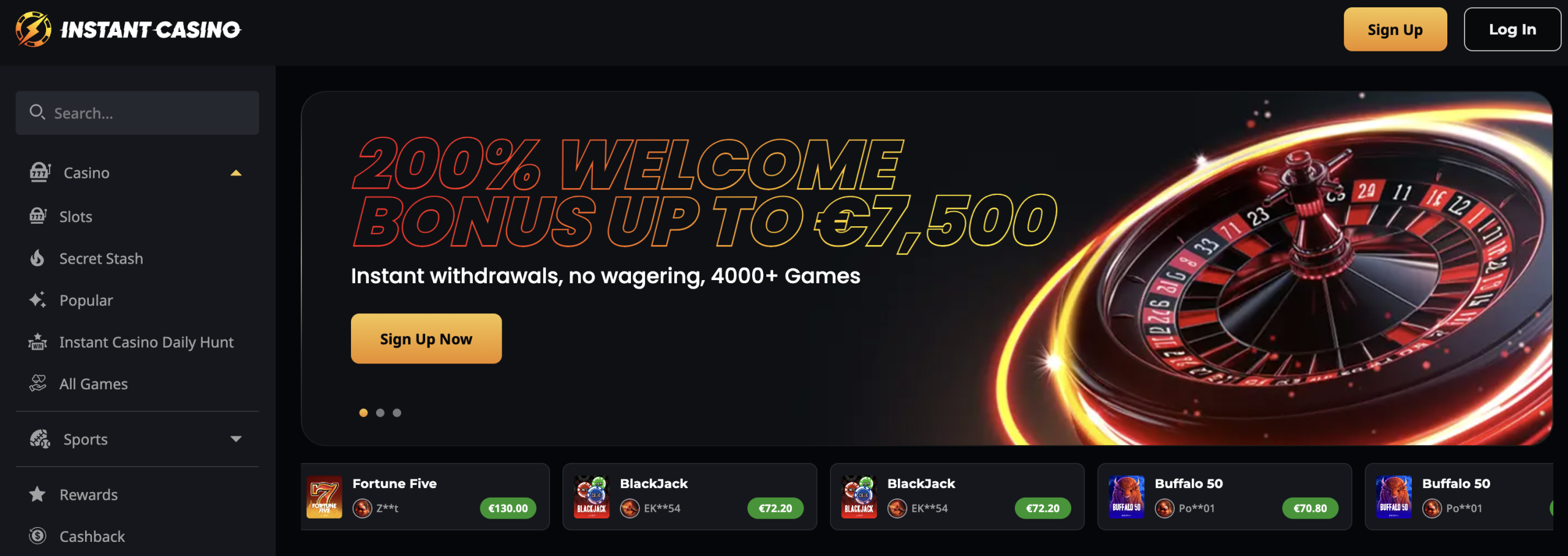 Instant Casino’s name reflects its actual differentiator. The platform launched in 2024 under Curacao licensing and built its identity around payout speed. We tested a withdrawal request and saw funds clear faster than any bank-transfer-based casino in this comparison.